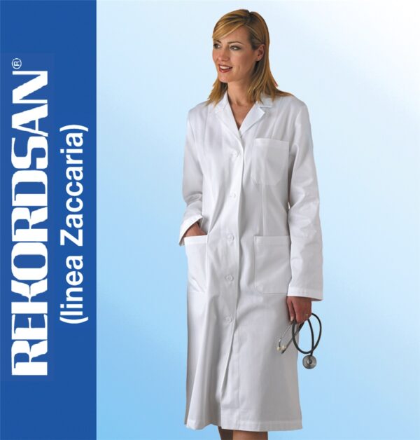Camice Donna, 100 % cotone gabardine con trattamento sanforizzato e dichiarazione di assenza di sostanze e materiali nocive.