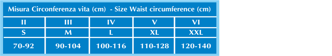 Speciale cintura sostenitiva corredata di 2 stecche paravertebrali con cuscinetto protettivo foderato in cotone e chiusura a strappo con 3 strisce adesive che assicurano un anatomico e confortevole sostegno.