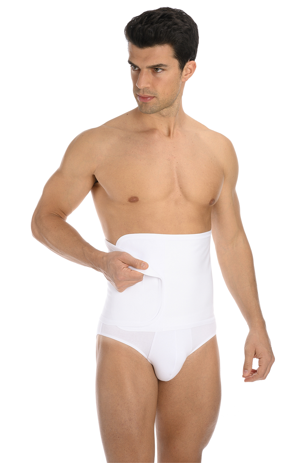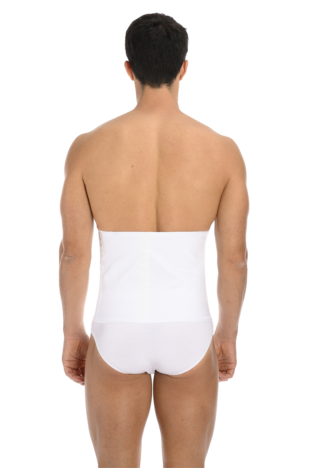 Cintura elastica in tessuto poliestensibile, elegantemente bordato, in igienico e fresco cotone con ampio pannello adesivo ed apertura regolabile. E’ corredata di due stecche paravertebrali flessibili che assicurano un anatomico e confortevole sostegno.