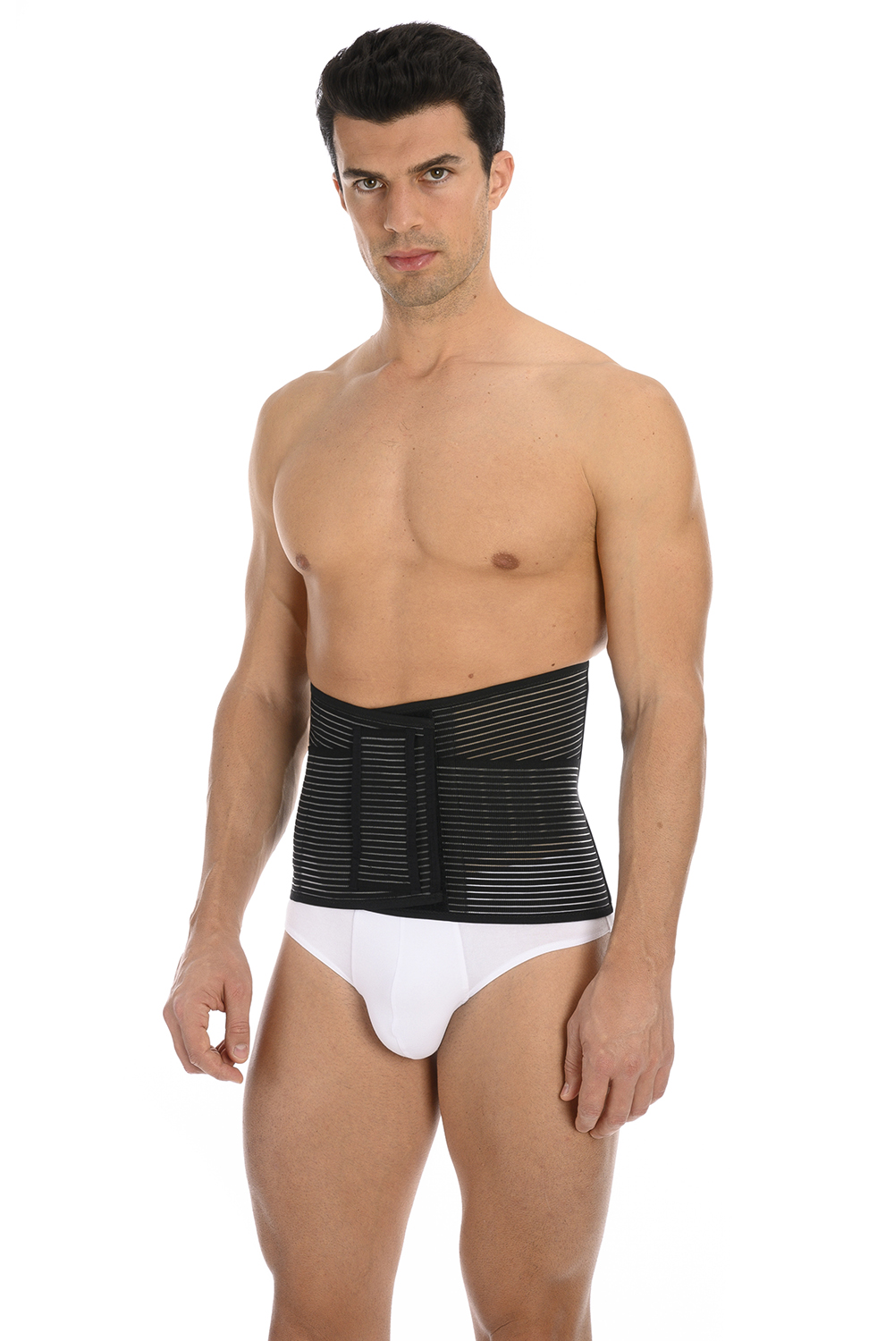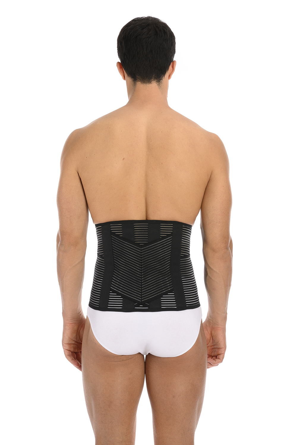 Dotato di 4 stecche paravertebrali modellabili per una perfetta aderenza del corsetto, 2 stecche anteriori antiarrotolamento e speciale pannello addominale ad ampia regolabilità.