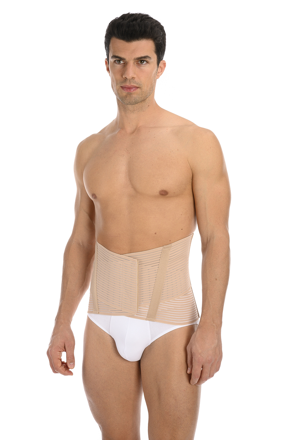 Corsetto in esclusivo igienico tessuto traspirante elasticizzato, rinforzato con incrocio dorsale sostenitivo e doppia fascia addominale che modella il corpo adattandosi perfettamente sia all’uomo che alla donna.