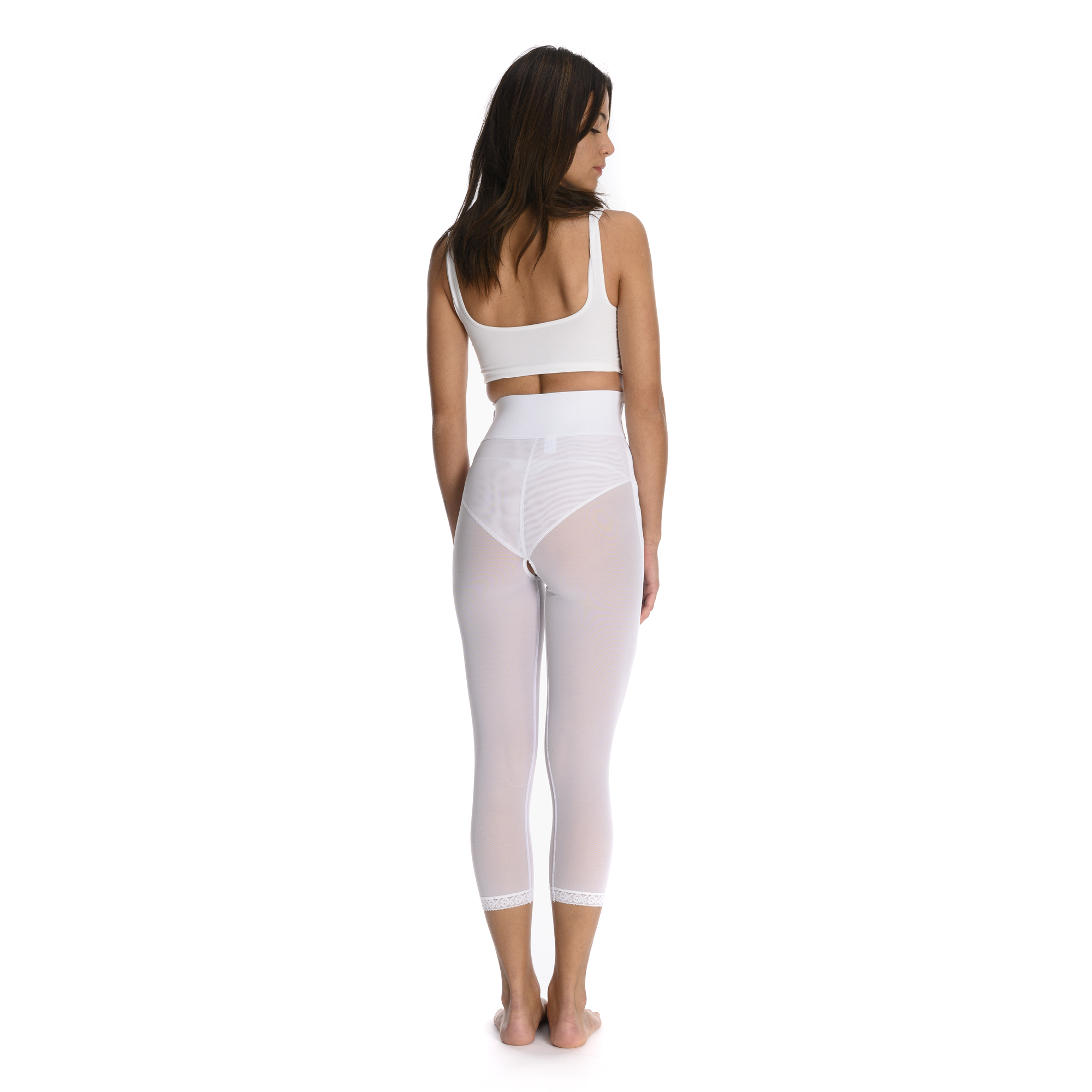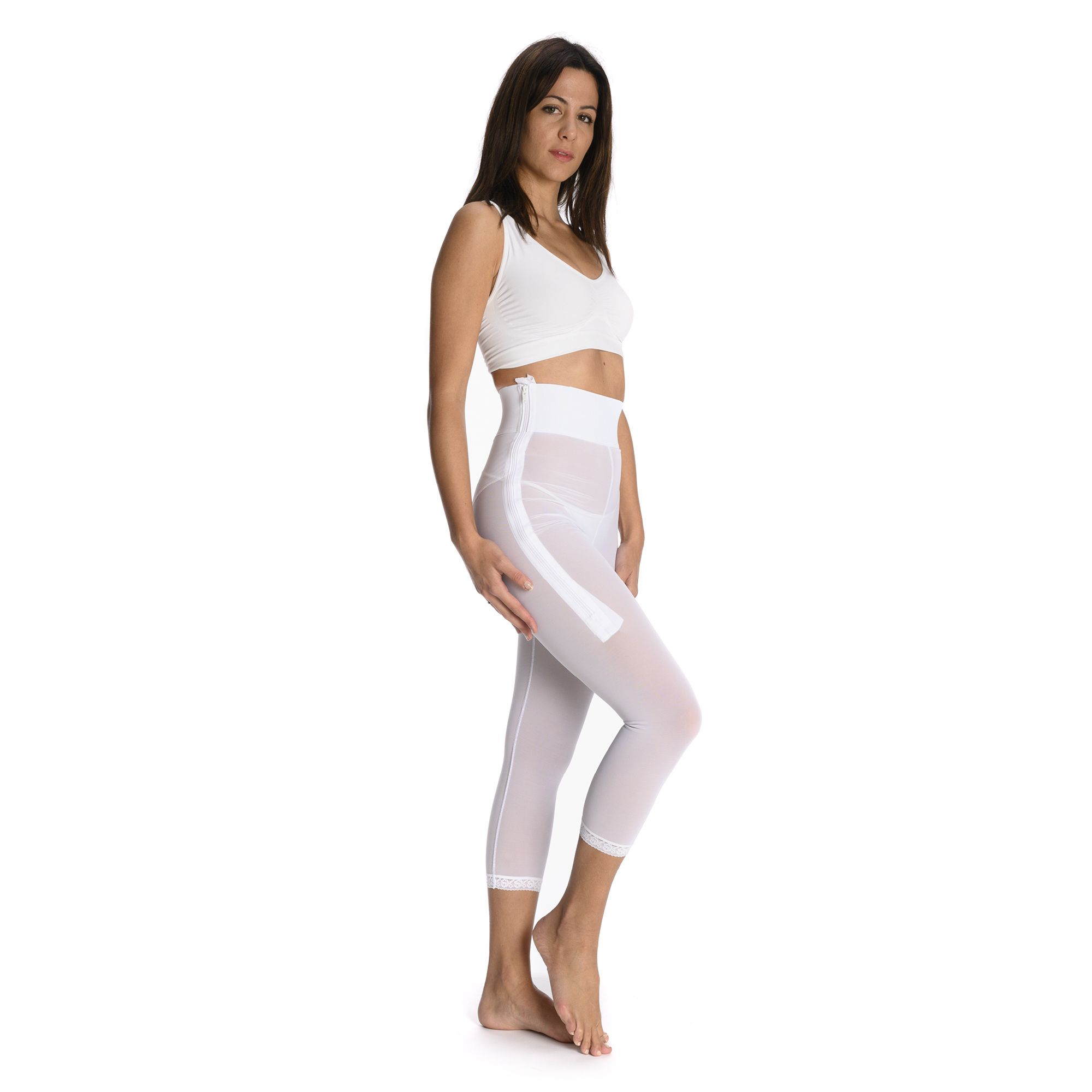 Guaina in tessuto elasticizzato aerato dotata di fascia alzabusto e di due cerniere laterali che consentono di indossarla con facilità.