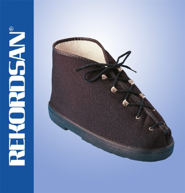 Speciale scarpa coprigesso Rekordsan con rivestimenti esterni in tessuti naturali, rivestimenti interni in morbido feltro, speciali suole leggere in gomma anti-sdruciolo, anatomici rinforzi e resistenti cuciture che, unitamente all’accurata lavorazione, garantiscono alle persone che le indossano sicurezza, confort e durata.