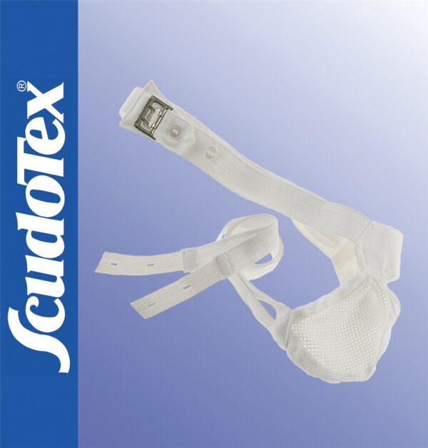Sospensorio in cotone con sottocoscia ed igienico e traspirante sostegno scrotale a borsa rete.