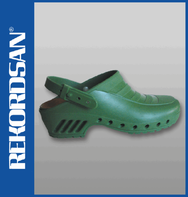 Zoccolo sanitario anatomico dotato di cinturino regolabile staccabile, può essere facilmente lavato a mano, in lavatrice o sterilizzato in autoclave sino a 134°C.